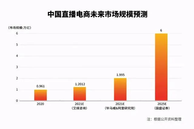 据艾媒咨询测算,2020年电商整体市场规模已达到了9610亿元,同比大幅增长121.5%;预计2021年全年中国电商直播行业市场规模将达到1.2万亿元;另外国盛证券预计,2025年全年中国电商直播行业市场规模将高达6万亿元。