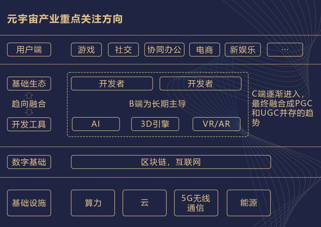 行业预计未来3-5年内:VR/AR、NFT、PUGC游戏平台、数字人、数字孪生城市等领域的技术突破与商业模式将层出不穷。