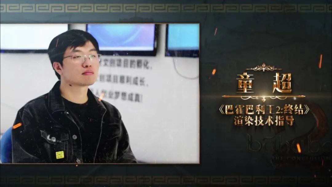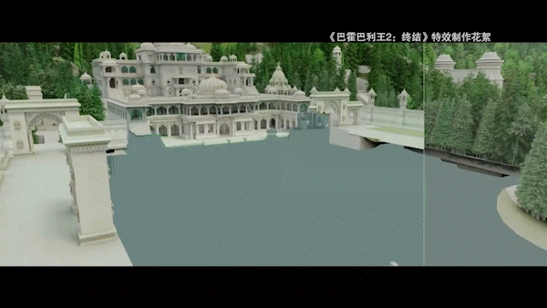 影片渲染技术指导童超:“在第一部中有很多群山、瀑布的画面,但主要是远景,这些远景的渲染难度是相对比较低的。给我印象比较深的是在第二部中有很多段宫殿建筑群的漫游动画,大部分都是一镜到底,这些镜头的整个场景完全是由虚拟场景制作合成,而且,在虚拟场景之上往往还伴有大规模的战斗画面,在画面细节的呈现上比第一部有着很大的提升。”